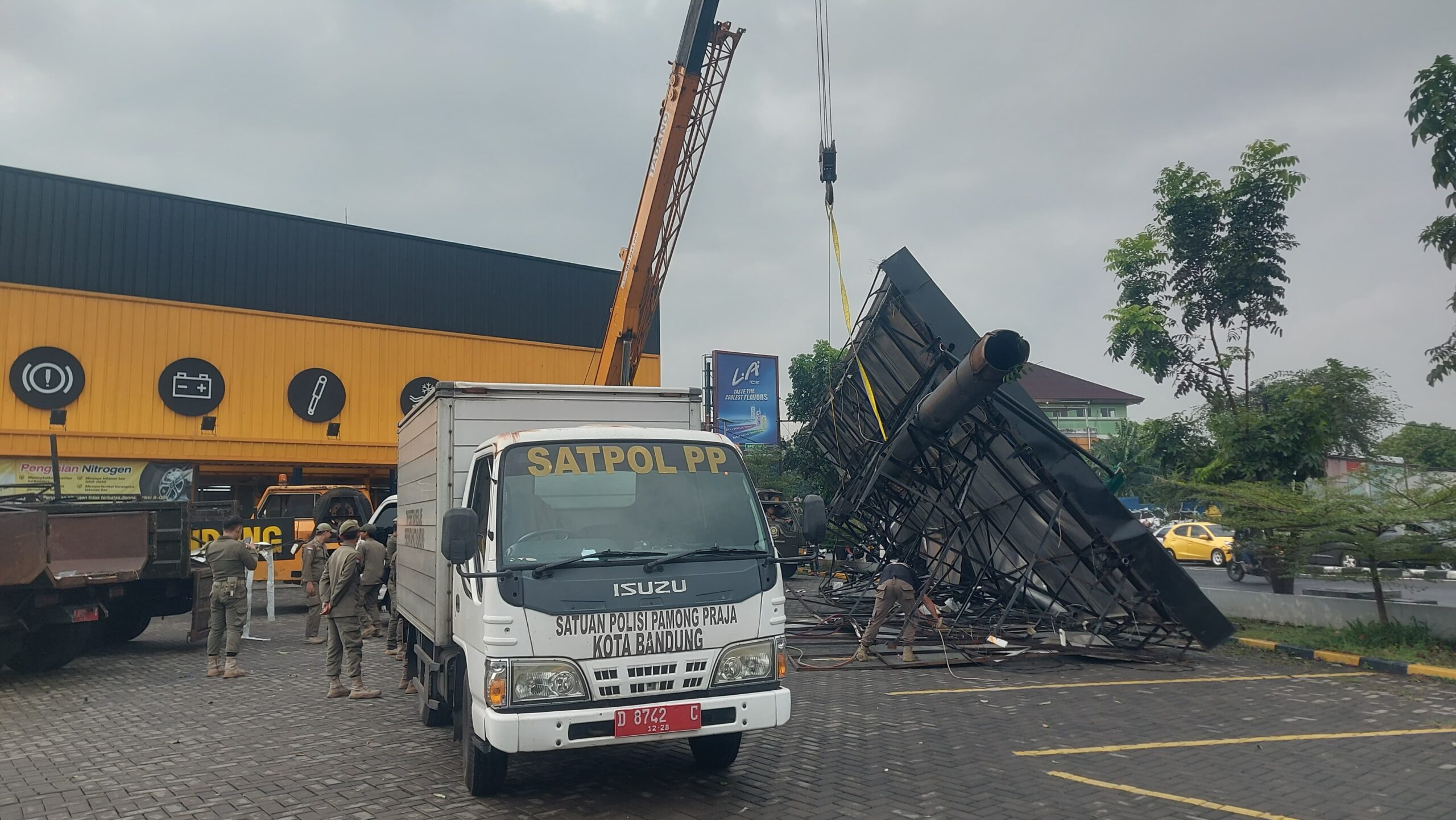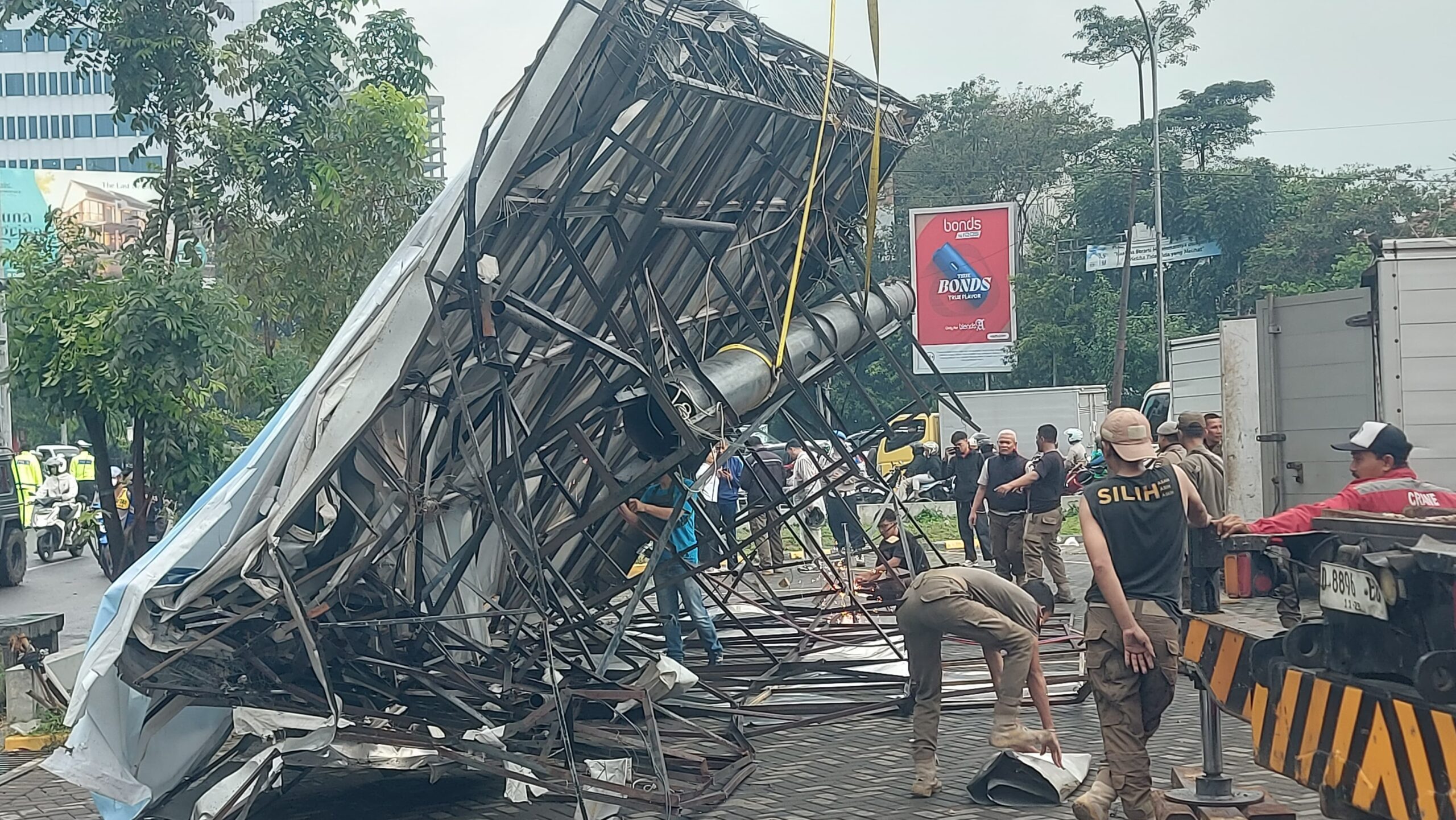 Peristiwa tersebut terjadi saat intensitas hujan cukup tinggi dan angin bertiup kencang, sehingga diduga menjadi penyebab utama ambruknya konstruksi papan reklame. Beruntung, tidak ada laporan korban jiwa dalam kejadian tersebut, meski sempat menimbulkan kepanikan bagi para pengguna jalan yang melintas di lokasi.